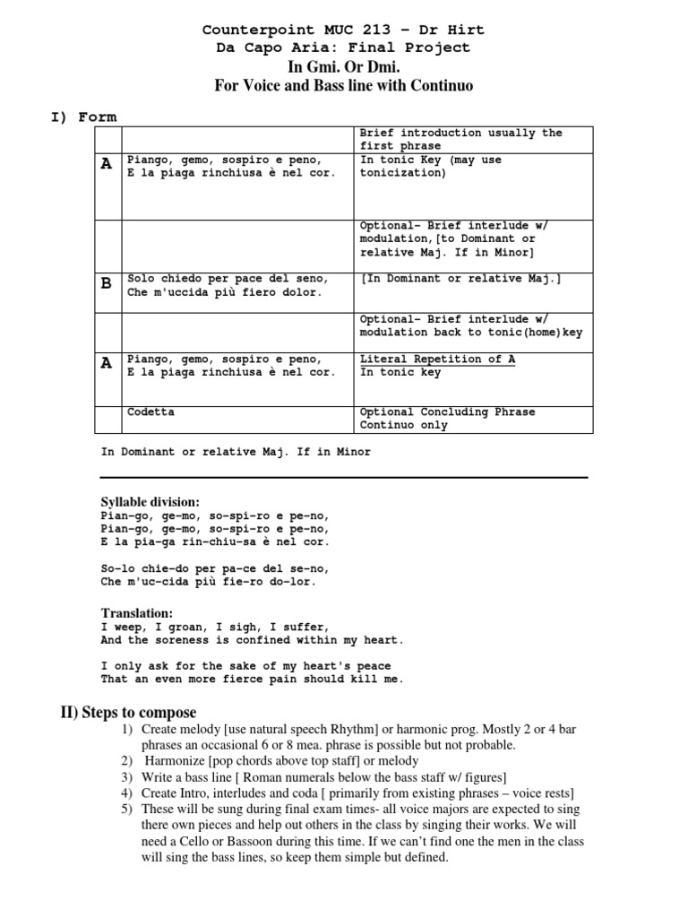 The da capo aria (Italian pronunciation: [da (k)ˈkaːpo ˈaːrja]) is a musical form for arias that was prevalent in the Baroque era.It is sung by a soloist with the accompaniment of instruments, often a small orchestra. The da capo aria is very common in the musical genres of opera and oratorio.According to Randel, a number of Baroque composers (he lists Hasse, Handel, Porpora, Leo, and ... Baroque period when the da capo aria and the concerto became popular: 1CUTHBERT GIRDLESTONE, ... aria; this form articulated the main key areas of a ... Similar diagrams can be drawn for the first movement of all of the other concertos by Mozart (see Ex. 4-1 for the musical examples for Figure 4-1).