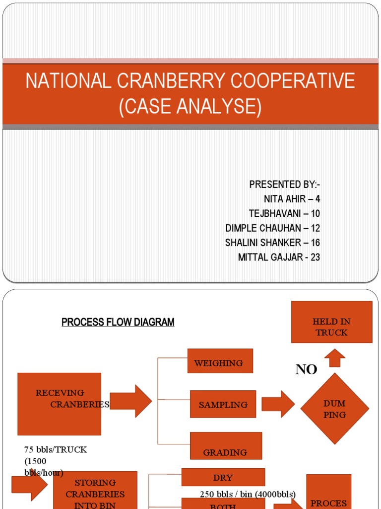 NATIONAL CRANBERRY CO-OPERATIVE CASE STUDY. Nishi Sharma In 1971, National Cranberry Cooperative faced recurring operational problems that affected the productivity and relationship of NCC to growers. This analysis will discuss how NCC can improve its operation before the peak-season comes in. The analysis was based from facts cited in the case ... View Homework Help - National Cranberry Case.docx from OPERATIONS 101 at New York University. a) Draw a process flow diagram for the process fruit operation of RP #1. Assume the arrival Trucks Mark the capacity and utilization of each resource in the process flow diagram at the end of this document. Briefly describe how you calculate the capacity and utilization here. [20 points] On average, 18000 barrels arrive over the 12hr p that the business is open. This means approximately 1500 barrels of berries are input into the process per hour (18000barrels/12hrs). The capacity of the ... THE COMPANY The Receiving Plant I (RPI) of National Cranberry Cooperative (NCC) processes both wet and dry cranberries in a highly mechanized process involving 400 workers during peak season. ... PROCESS FLOW. The process flow diagram is attached as Exhibit A ANALYSIS From Figure E in the case Delivery begins at 7 AM Processing begins at 11 AM ...