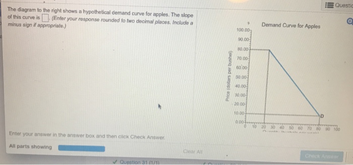 Question: The diagram to the right shows a hypothetical demand curve for apples. The slope of this curve is(Enter your response rounded to two decimal ...