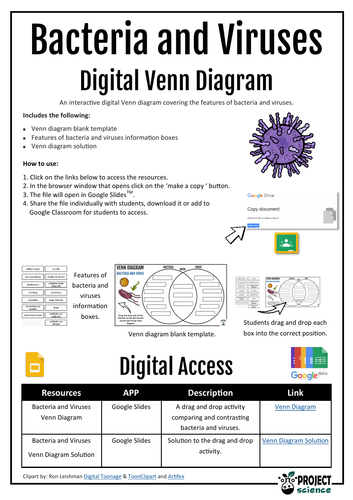 The bacteria and virus Venn diagram graphic organiser is a great way for students to compare and contrast these two microbes. Includes two versions: Version 1. Students cut and paste labels onto the correct part of the Venn diagram. Version 2. Students write the correct statement into boxes on the Venn diagram.
