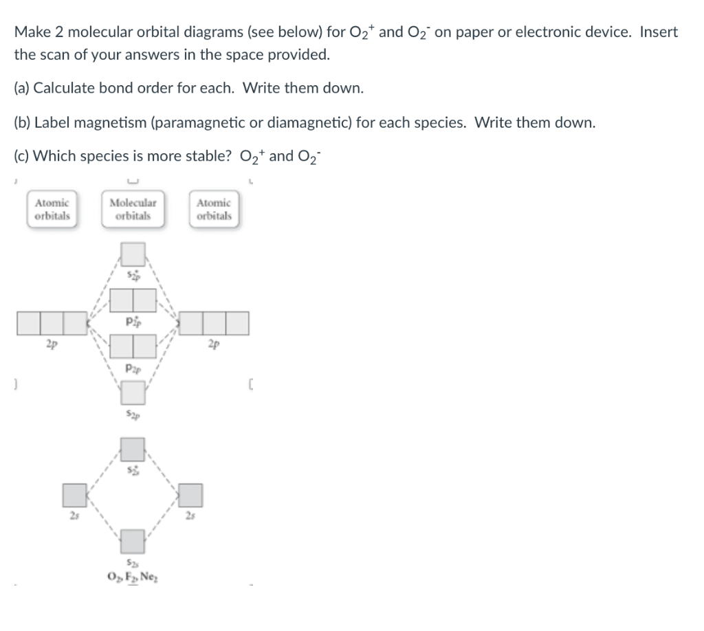 O2+ molecular orbital diagram. Download scientific diagram | Schematic of the 'O2' molecular orbital diagram. The figure explains the nature of the oxygenated (O2)n− species that we are discussing within the text and to highlight the fact that we are dealing with holes (or electrons) having antibonding characters. The orbital diagram for a diatomic molecule is. To find the bond order, add the 15 electrons in the molecular orbitals (the blue-colored energy levels in the diagram) one at a time until you have used them up. They completely fill all the orbitals except the highest-energy antibonding sigma 2p orbital. A bare molecular orbital diagram is presented and you must drag the correct orbitals and labels onto the diagram. The diagram is then completed by filling the energy levels with the correct number of electrons. The following molecules are currently available: Molecules of the First Row Figure 8: Molecular orbital energy-level diagrams for (A) beryllium hydride, BeH2, with linear shape, and (B) water, H2O, with bent shape. The molecular orbitals are labeled to reflect the atomic orbitals from which they are composed as well as their symmetry properties.