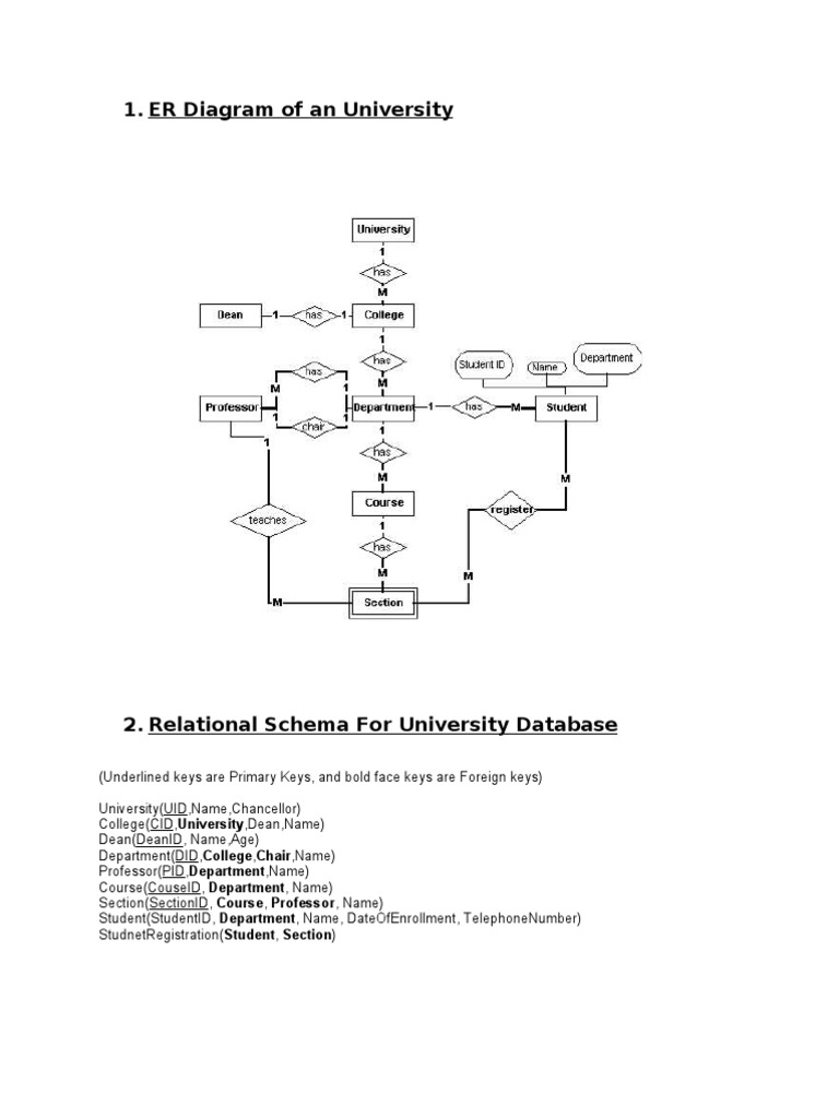 ER Diagram of An University | PDF | Relational Model ... 1. ER Diagram of an University. 2. Relational Schema For University Database (Underlined keys are Primary Keys, and bold face keys are Foreign keys) University(UID,Name,Chancellor) College(CID,University,Dean,Name) Dean(DeanID, Name,Age) Department(DID,College,Chair,Name) Professor(PID,Department,Name) Course(CouseID, Department, Name) Section(SectionID, Course, Professor, Name) Student ...