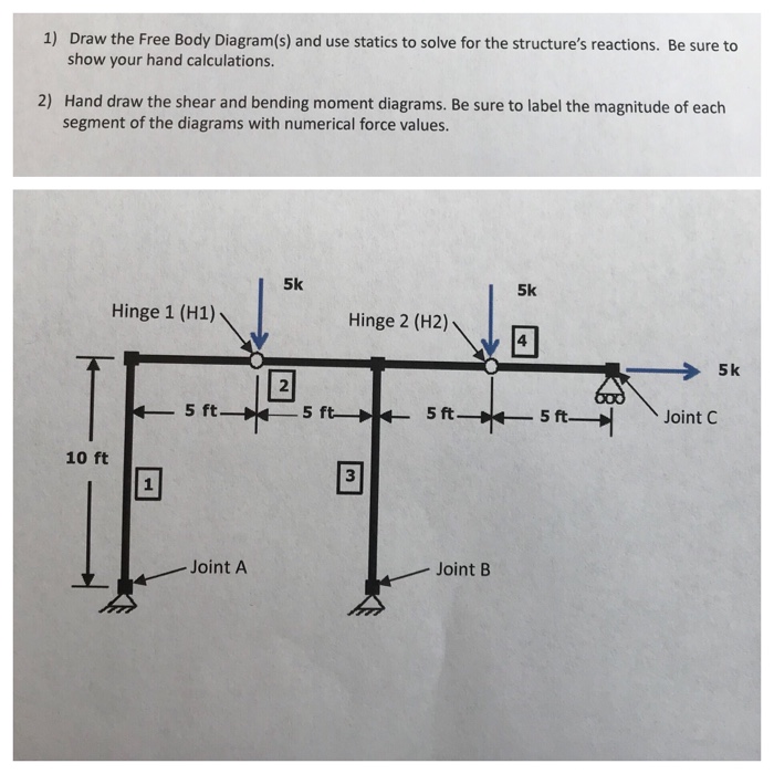 Free body diagram statics. To complete the Free-Body Diagram (FBD) all the forces need to be drawn. The tension forces in the cable are labeled T 1 and T 2 because they are not in the same direction nor are they equal. In addition, the cable car is symmetric about the y axis, and therefore the support forces will be equal in magnitude. These forces are labeled F S. I got a homework in Mechanics Statics, where I need to do a three dimensional free body diagram of a engine hoist, here are some pics of it [https://imgur.com/a/rmTmyuQ](https://imgur.com/a/rmTmyuQ) I already made a general FBD, but I need to do more FBD to determine all of the internal forces in it. I don't think I will have any major problem making the calculations, but I don't know how I should "disassemble" the hoist to get all of the internal forces. For example in this pic: [https://imgu... Forces, free body diagrams, moment due to a force, and then equilibrium for bodies under action of simple concentrated forces (no couples, distributed loads, or engineering connections). The authors believe a first exposure to equilibrium with attention to free body diagrams and the summation of forces and moments is valuable before introducing the couple , static equivalence, and engineering connections. https://goo.gl/ICIenR for more FREE video tutorials covering Engineering Mechanics (Statics & Dynamics)This video represents a comprehensive example of solvi...