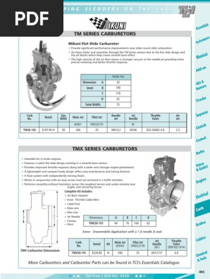 Mikuni Genuine Carburetor & Fuel Pump Rebuild Kits - Mikuni Power Mikuni_MK-TM35-38_Rebuild_Kit_Diagram.jpg. Mikuni MK-TMX36-19 Carburetor Rebuild Kit for 2000-2001 Honda CR125 and 2001-2003 Honda CR250 Motorcycles where the OEM TMX36 Mikuni Carburetor is used. This Kit includes the needed Genuine Mikuni Parts to return your carb to like-new condition. Due to jet variations, this kit does NOT include any Sudco Intl. Corp. - Mikuni Diagrams Dealer Online Ordering. Mikuni Carburetors Diagrams. Sudco carries the widest selection of performance carburetors and parts from Mikuni and Keihin. Sudco has you covered from motocross to drag racing.. and everything in between. BN Watercraft Diagram -- Click Here. Back to Top. MIKUNI TM SERIES FLAT SLIDE CARB EXPLODED VIEW Mikuni jets TM SERIES FLAT SLIDE carb carburetors and parts. ... Other TM series parts in addition to what is listed below.
