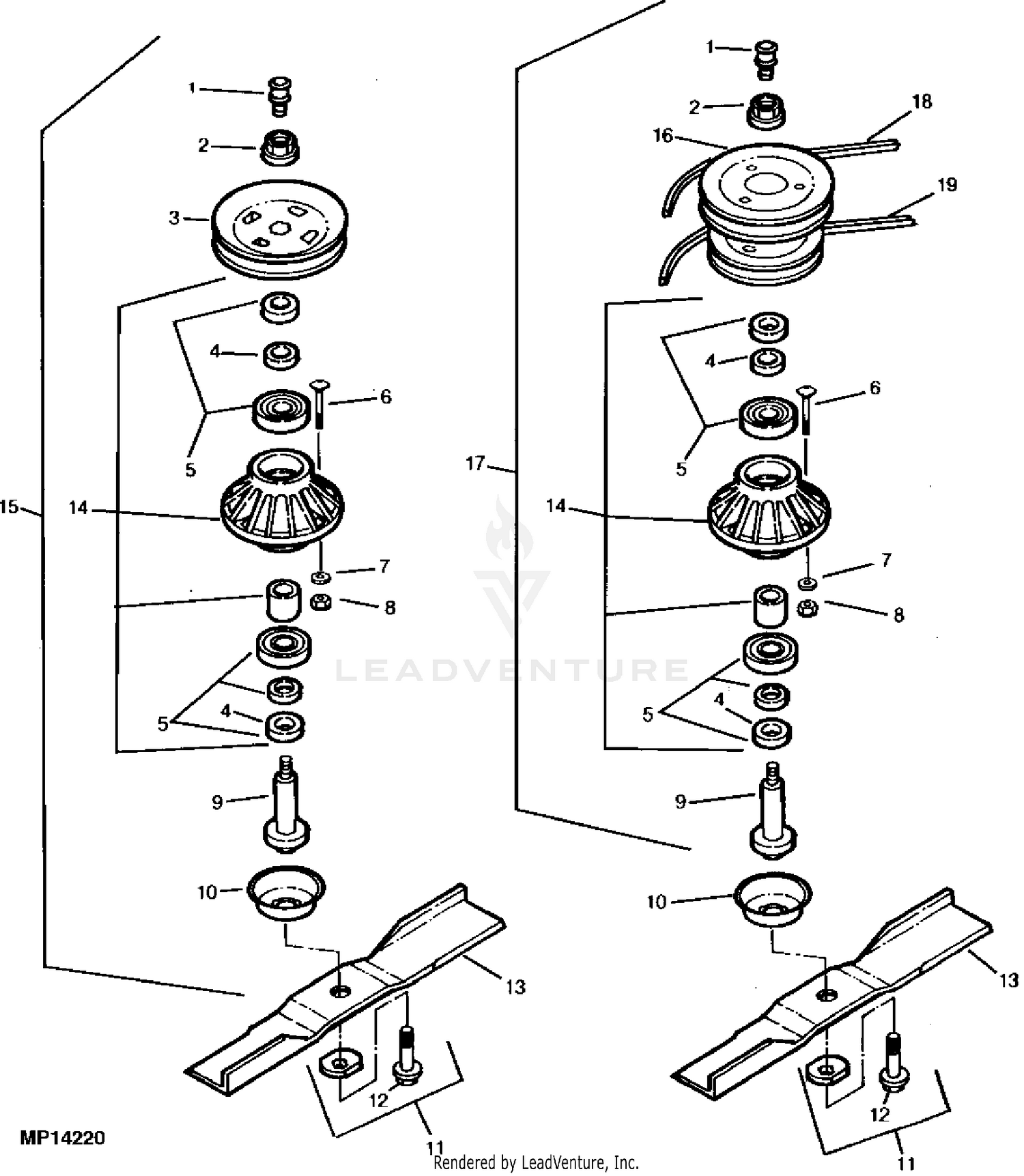 Belt Routing Charts for Lawn Mower Decks Canada designed to contact the inside of the belt. Here are a few examples of John Deere belt routing diagrams. The one on the left is for a front mount mower deck. A few more examples of different belt routings. Make sure the belt doesn't rub against anything before you tighten everything. Again, it's worth the time to study what is a flat pulley