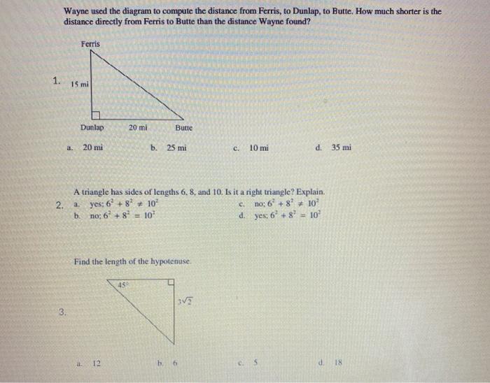 The distance from a point to a line segment [duplicate] I'm pretty sure this may be a duplicate post somewhere, but I've searched all through the internet looking for a definite formula to calculate the distance I actually have several points that I will be looping through to get their distances. Each point will be within the boundary of the segment(if that... Solved Wayne used the diagram to compute the distance from How much shorter is the distance directly from Ferris to Butte than the distance Wayne found? Ferris 1. 15 mi Dunlap 20 mi Butte 20 mi b. 25 mi c. 10 mi d. 35 mi 2. A triangle has sides of lengths 6, 8, and 10. We review their content and use your feedback to keep the quality high. Wayne used the diagram to compute the distance from Ferris, to... How much shorter is the distance directly from Ferris to Butte than the distance Wayne found? a. 20 mi b. 25 mi c. 10 mi d. 35 mi 5. A triangle has sides of lengths 6, 8, and 10. This site is using cookies under cookie policy . You can specify conditions of storing and accessing cookies in your browser. Right Triangles Test Review - PDF Free Download 2 4. Wayne used the diagram to compute the distance from Ferris, to Dunlap, to Butte. How much shorter is the distance directly from Ferris to Butte than the distance Wayne found? a. 20 mi b. 25 mi c. 10 mi d. 35 mi 5. A triangle has sides of lengths 6, 8, and 10.