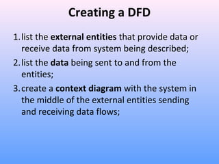 Developing Data Flow Diagrams (DFDs) - W3computing.com All external entities are shown on the context diagram, as well as major data flow to and from them. The diagram does not contain any data stores and is fairly simple to create, once the external entities and the data flow to and from them are known to analysts. Drawing Diagram 0 (The Next Level)